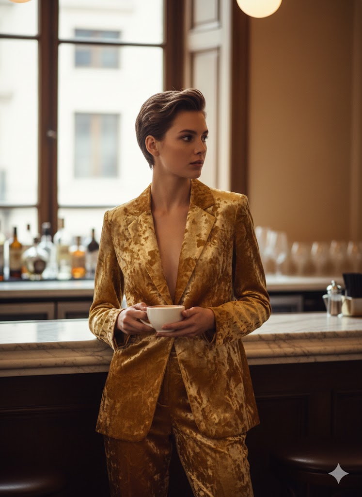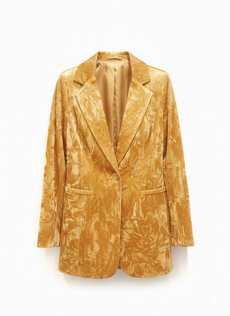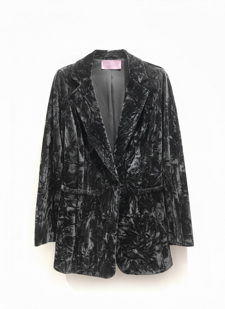 Giacca in ciniglia martellata che cattura la luce con un affascinante effetto shiny. Caratterizzata da un'elegante chiusura a un bottone e spalline strutturate che definiscono la silhouette. La linea avvitata e la lunghezza regolare creano una proporzione perfetta, ideale per composizioni versatili che passano senza sforzo dal giorno alla sera. Un capo essenziale che eleva qualsiasi outfit con raffinatezza.