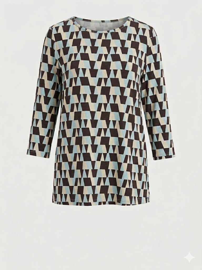 Girocollo in jersey morbido con stampa geometrica all over che gioca su tonalità armoniose e motivi contemporanei. Il design versatile si abbina perfettamente ai pantaloni della linea, creando outfit coordinati e raffinati. Ideale per chi ricerca eleganza senza compromessi, con la comodità di un capo che passa dal giorno alla sera. Tessuto di qualità che mantiene forma e colore nel tempo.