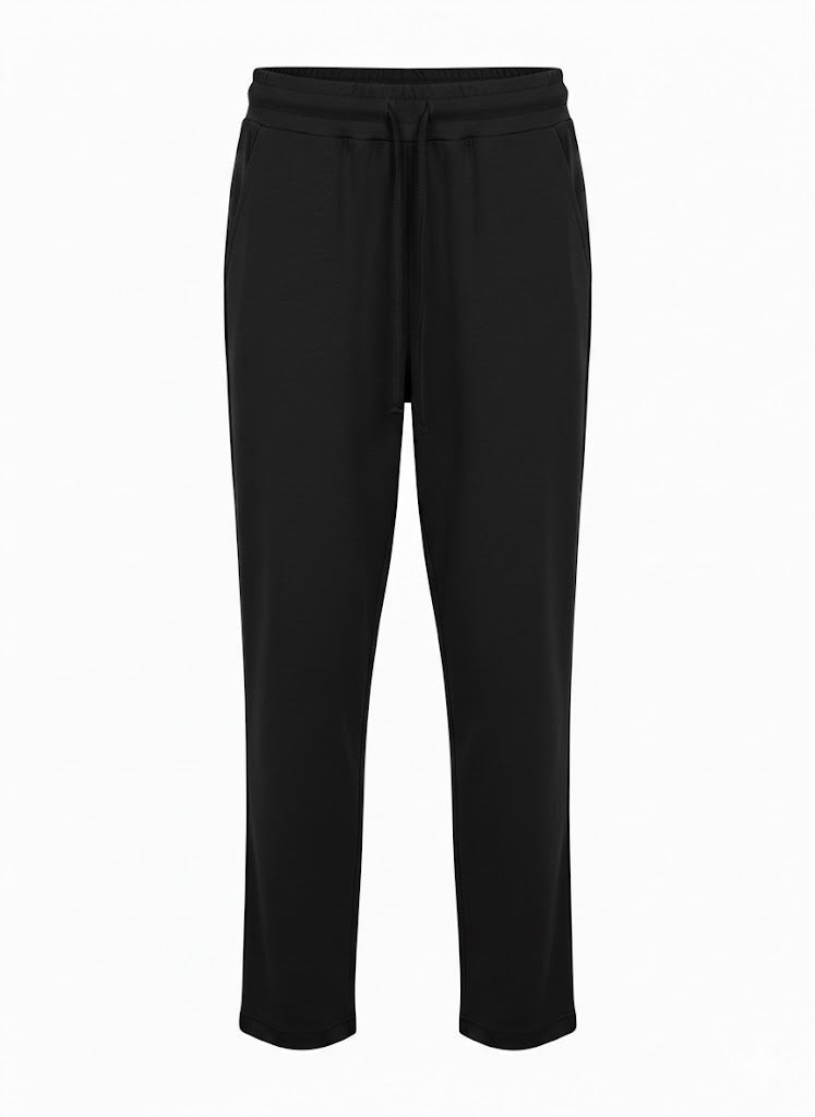 Pantalone dalla silhouette moderna e raffinata, realizzato in tessuto elasticizzato che garantisce comfort e libertà di movimento. La vita è dotata di elastico e coulisse regolabile, permettendoti di personalizzare la vestibilità secondo le tue preferenze. La gamba stretta con risvolto al fondo crea una linea elegante e contemporanea, perfetta per composizioni versatili dal giorno alla sera. Un capo essenziale che unisce praticità e stile sofisticato.