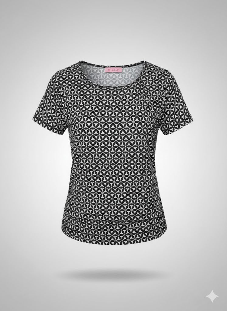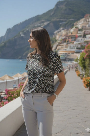 T-shirt slim fit bimaterica che combina eleganza e comfort. Il fronte in raso di viscosa offre una finitura sofisticata con stampa triangoli geometrica, mentre il retro in jersey di viscosa garantisce morbidezza e traspirabilità. Girocollo classico per un look versatile e raffinato, perfetto per styling casual e più ricercati.
