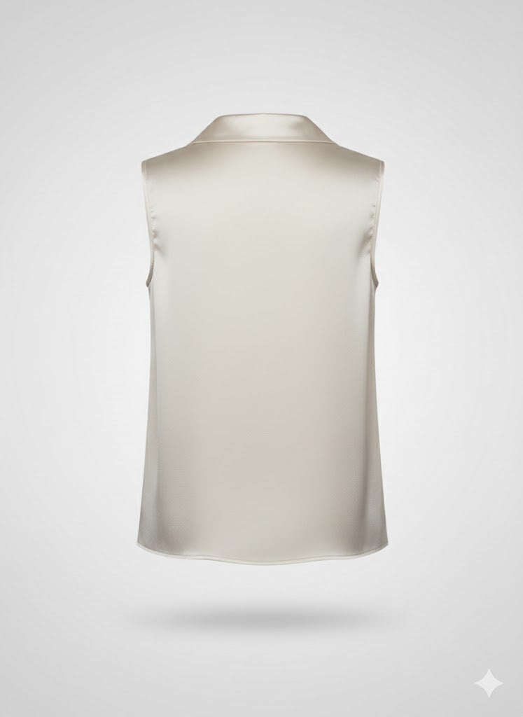 "Scopri l'armonia perfetta tra rigore sartoriale e freschezza contemporanea con il nostro nuovo top in seta smanicato. Un capo iconico, pensato per chi cerca un'eleganza disinvolta che non passa mai inosservata.